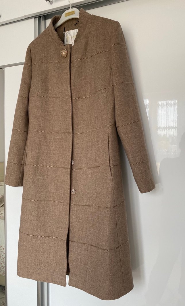 Bej renkli, uzun kesim, düğmeli kadın kabanı. Yün kumaştan ve klasik modern tarzda, ofis kullanımı için uygun. Dar kesim