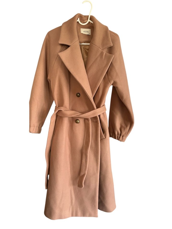 Bej renkte, uzun boylu yün kumaştan yapılmış, kemerli ve klasik kesim yakalı modern klasik tarzda kadın kabanı. Strappy kollu ve günlük kullanıma uygun.L bedenlerde giyebilir