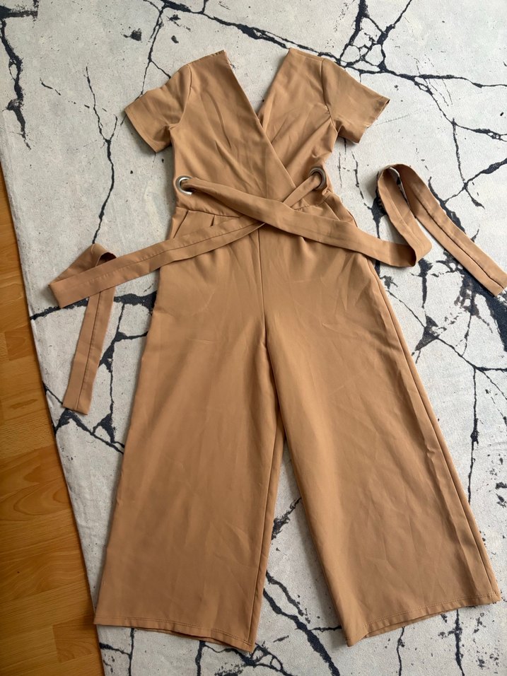 Bej renkli, V yakalı ve kemerli kadın tulumu, yumuşak sentetik kumaştan üretilmiş. Uzun boy ve regular fit kesimiyle şık bir sokak stili seçeneği sunar. 155 boya uygun bilekte Arkada söküğü var dikelebilir