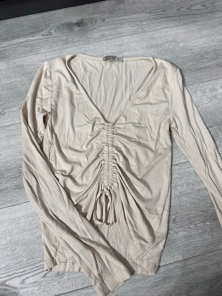 Bej renkte, uzun kollu ve V yakalı stradivarius bluz 3-4 kere giyildi