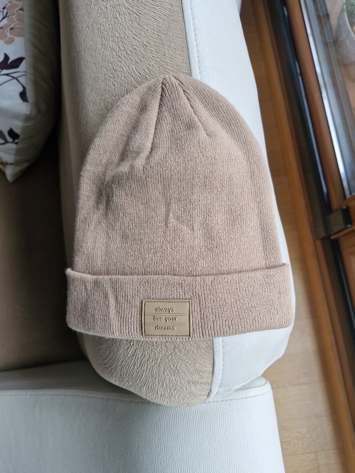 Bej renkli, yumuşak ve sıcak dokulu örgü bere, önünde küçük bir etiketle sade tasarıma sahip. Rahat sokak stili için Kadın ve erkek için uygun.