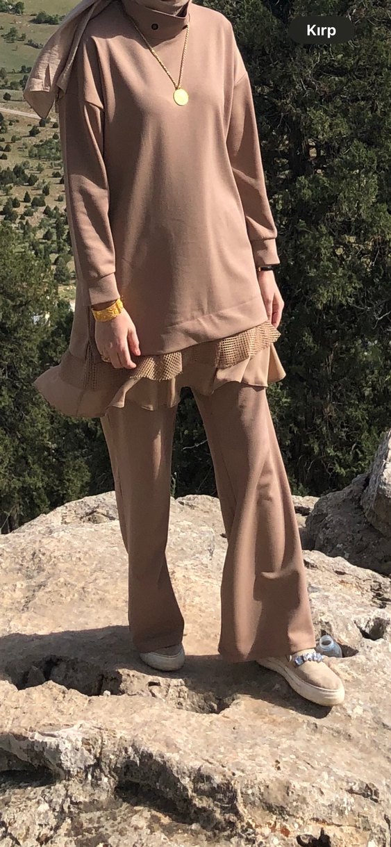 Bej Kadın Volanlı Salaş tunik ve pantolon