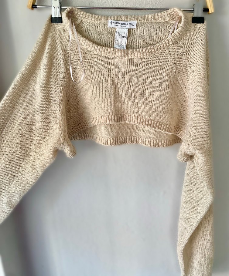 Bej renkli, yuvarlak yakalı ve uzun kollu, bol kesim örgü kazak.Kısa cropların üstüne yakısacak , sade ve rahat tarzda, günlük kullanıma uygun. 1 kere giyinilmistir herhangı bir kusuru yoktur.