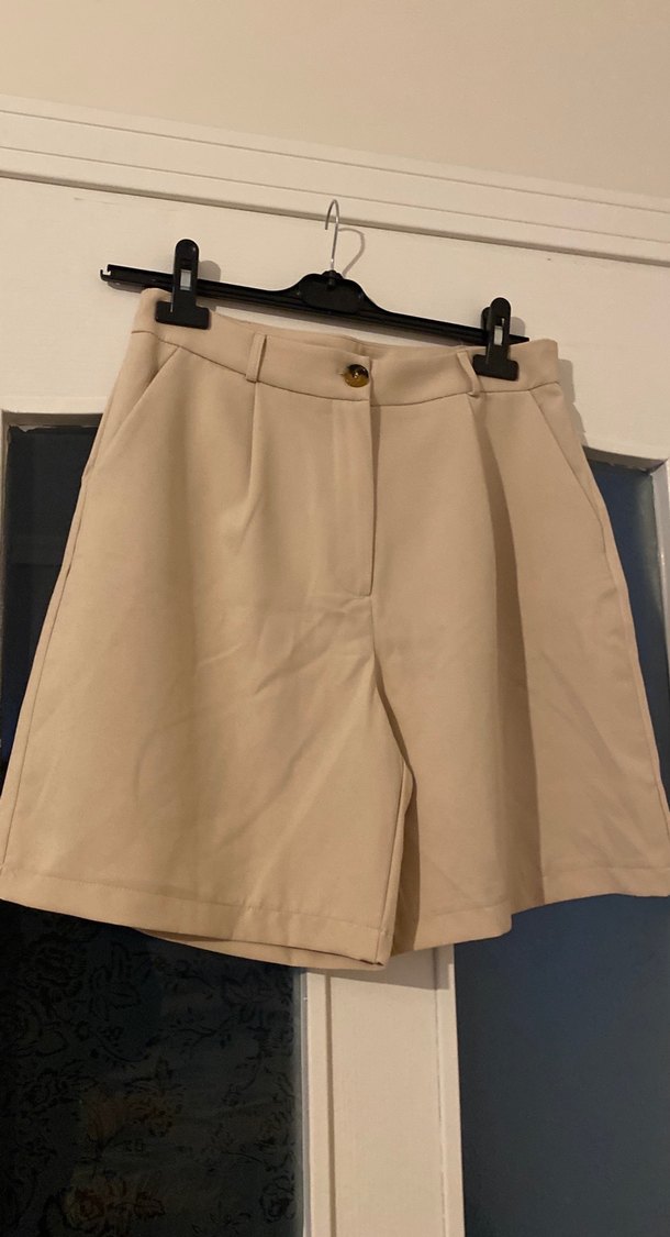 Bej renkli, düğmeli yüksek bel mini şort, bol kesim ve sentetik kumaştan, ofis ve günlük kullanıma uygun.