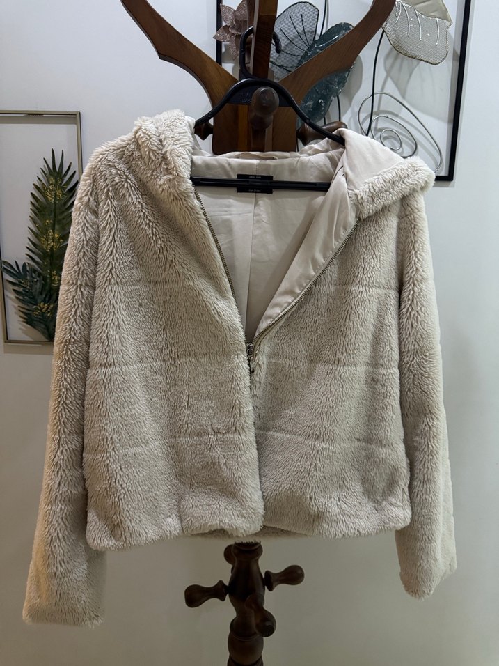 Bej renkte, yumuşak kürk detaylı, bol kesim ve uzun kollu kadın ceketi. Notlu yaka ve midi boyda, günlük kullanıma uygun rahat bir sokak stili.