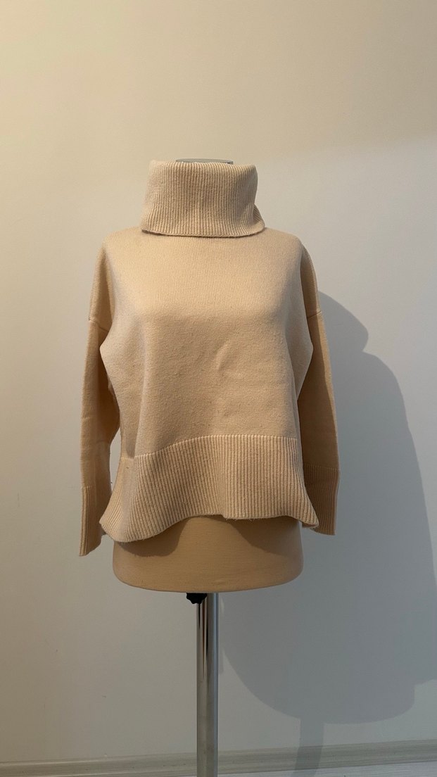 Bej renkli, yün ve örgü dokulu, boğazlı ve uzun kollu kadın kazak. Rahat kesimi ve midi boyu ile günlük kullanıma uygun, çağdaş tarzda bir parça.