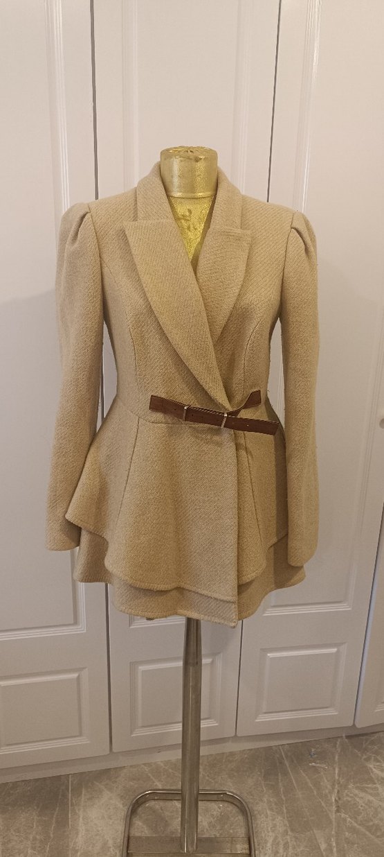 Bej Kadın Yün Kemerli Midi Klasik Ceket