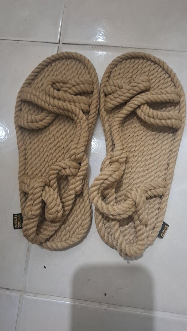 Bej renkli, yün malzemeden yapılmış, elastik bantlı ve dolgu topuklu kadın sandalet. Rahat ve bohem tarzda, günlük kullanıma uygun.