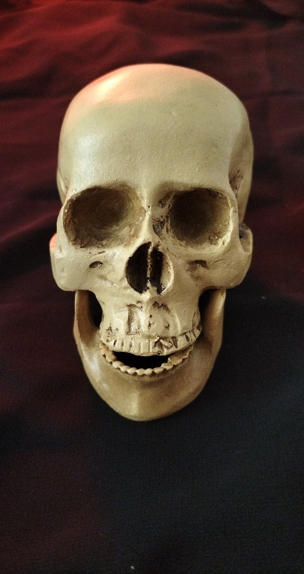 Koyu gölgeli detaylara sahip bej renk kafatası figürü, gerçekçi kemik dokusu ve boş göz oyukları içerir. Dekorasyon için uygundur.