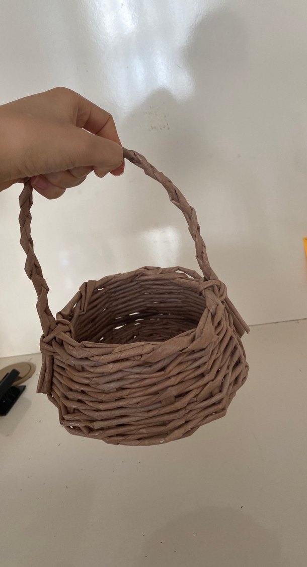 Sağlam saplı bej hasır sepet çanta, küçük eşyaları taşımak veya saklamak için uygun.