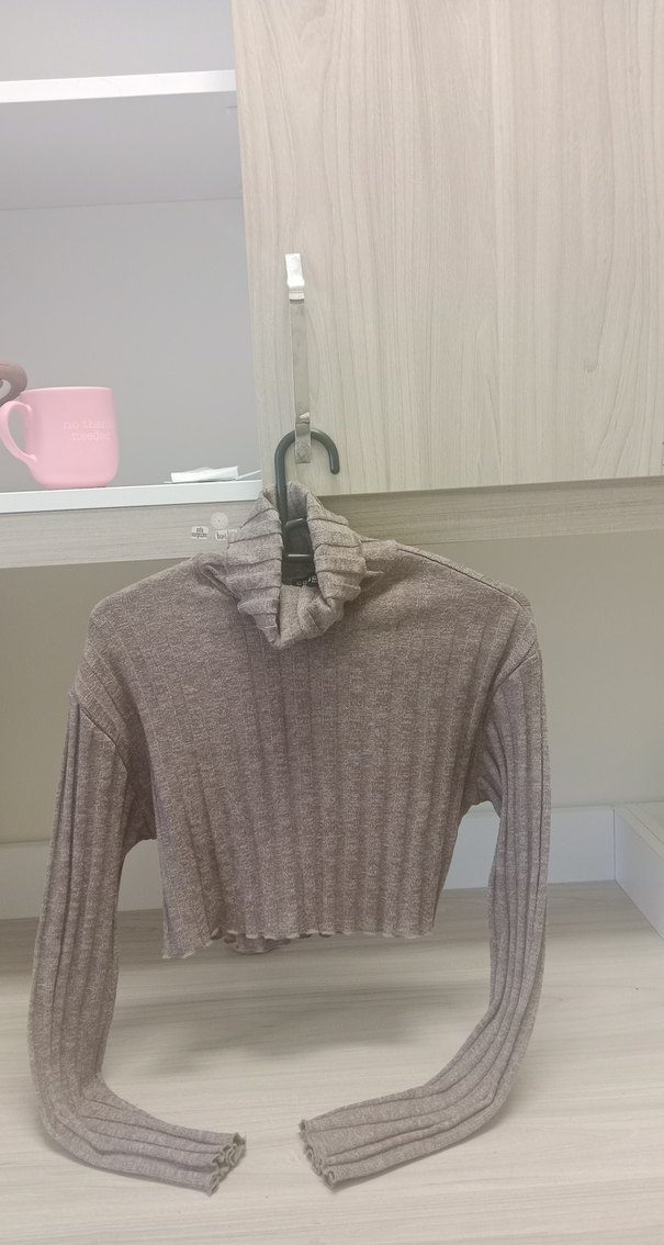 Boğazlı, uzun kollu, bej kahve renkli triko kumaştan yapılmış, günlük kullanıma uygun sade ve fitted kesim kadın kazak.