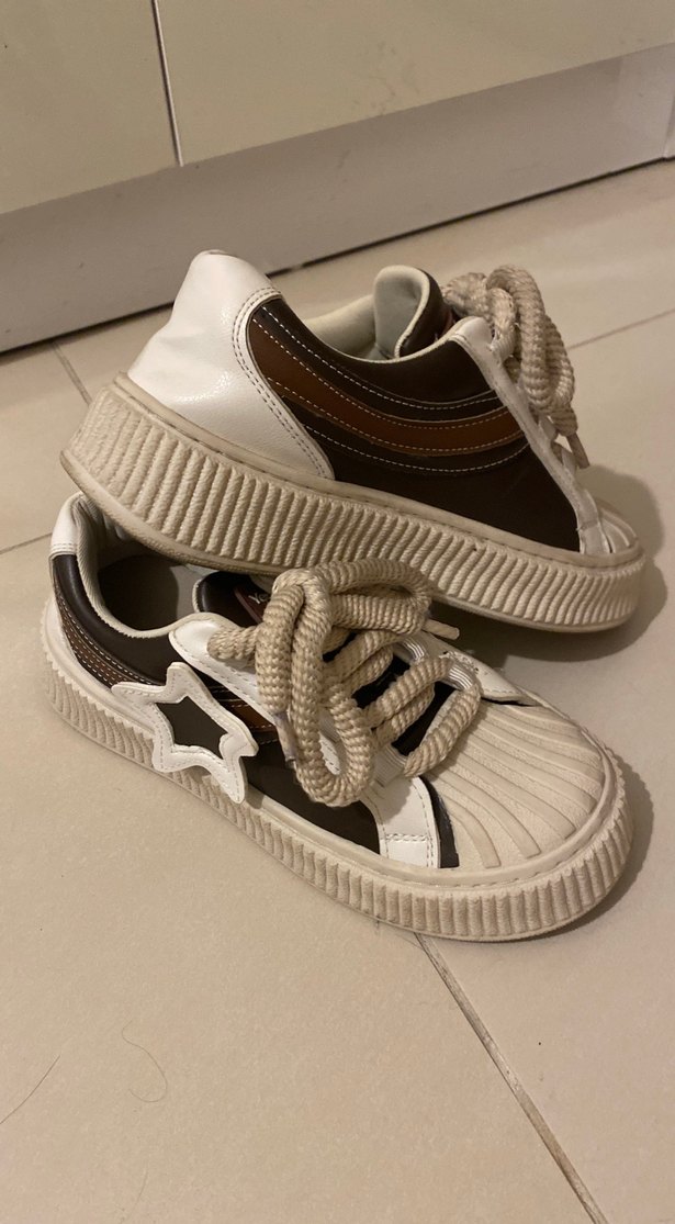 38 numara Bej ve kahve bağcıklı kadın spor ayakkabısı Topuk boyu 4cm Ön kısmı plastik İthal suni deri Tak çıkar yıldız 1 adet