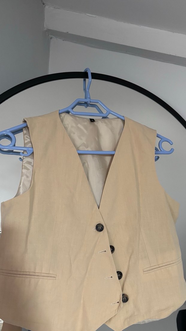 Bej ve kahve renkte, keten kumaştan yapılmış, düğmeli ve kesik yaka detaylı kadın yeleği. Normal kesim ve midi boyda, minimal ve normcore tarzda, günlük kullanıma uygun. İkisini de hiç giymedim, zayıflarım diye beklettim. Biri 36 biri 38 bedendir. Yıkayıp denediğim için iade de edemedim. Şimdi de satışa çıkarıyorum ☺️