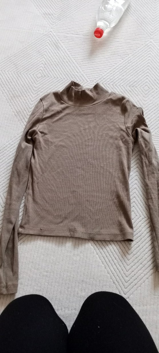 Bej kahve karışımı gibi rengi, uzun kollu ve boğazlı kesime sahip, yumuşak yapılmış dar kesim kadın triko. Günlük rahat kullanıma uygundur. S M bedenler için uygundur crop gibi kısa değil