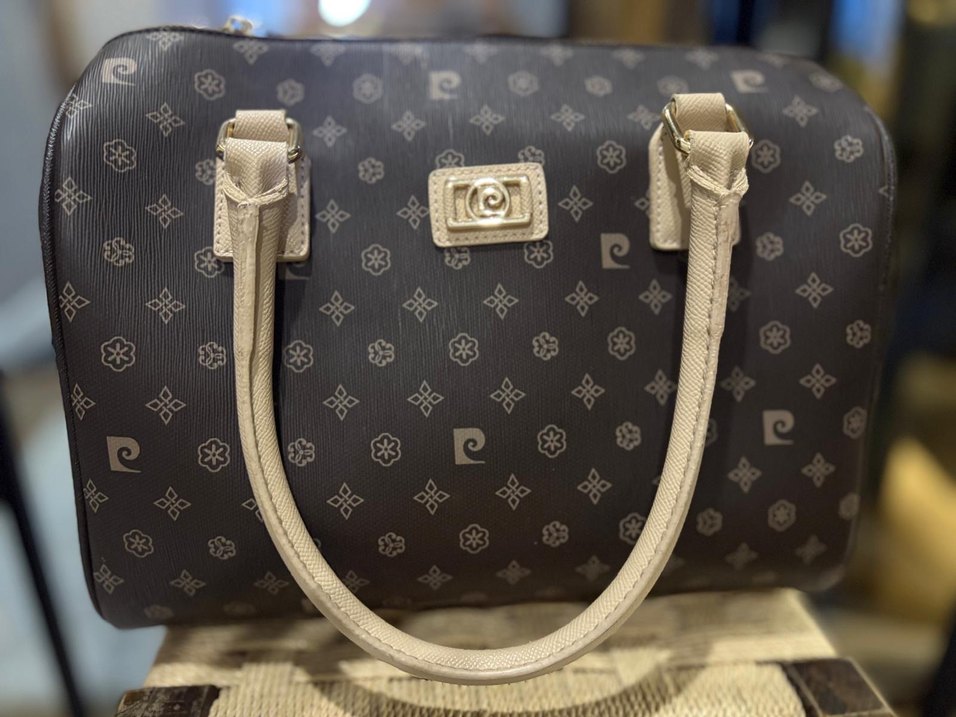 Bej renkte, pierre cardin desenli deri kadın çanta, tokalı saplarıyla günlük kullanıma uygun klasik ve şık bir modeldir.