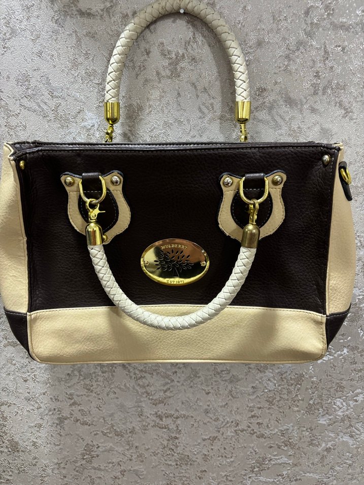 Bej ve koyu kahverengi deri birleşimi, parlak yüzeyli kadın çanta. Tokalı detaylar ve örgülü saplarla modern klasik tarz sunar. Günlük kullanıma uygun.