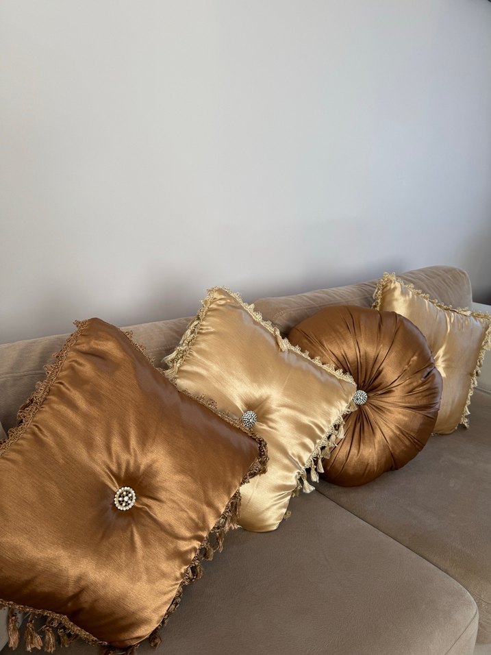 Parlak kumaş ve nakış detaylarına sahip bej yastıklar, püsküller ve dekoratif düğmelerle modern klasik tarzda tasarlanmıştır. ️