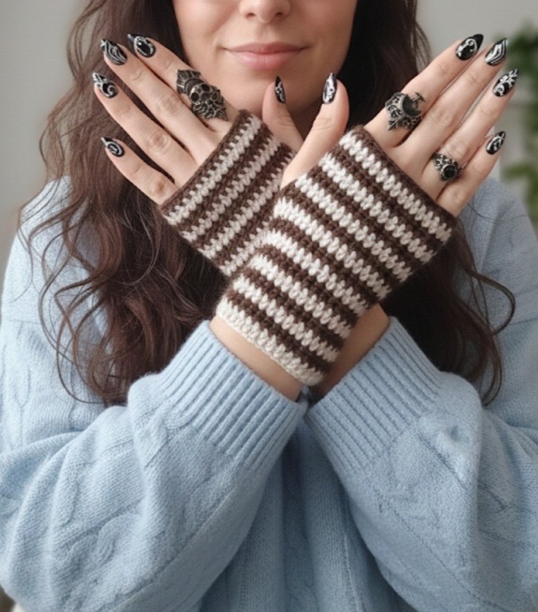 GÖRSEL BANA AİTTİR ✔️ İLAN AÇIYORUM ✨️ Bej ve kahverengi çizgili, örgü yapıda bohem tarzda kadın eldivenleri, retro ve hippie stiller için uygun.