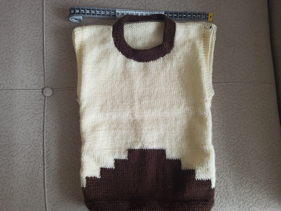Yumuşak dokulu, bej ve kahverengi örgü bebek süveteri. Yuvarlak yaka ve alt kısmında blok desen bulunur.