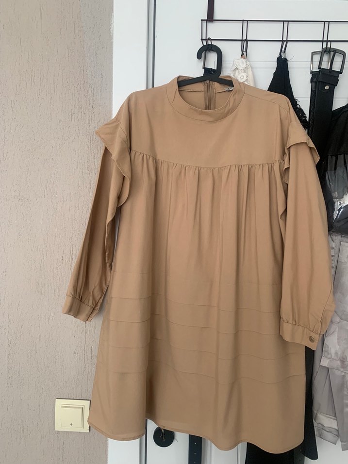 Bej kahve tonlarındai, keten kumaştan, uzun kollu, fırfır detaylı ve yüksek yakalı bol kesim tunik. Minimalist ve normcore tarzda, gündelik kullanıma uygun.