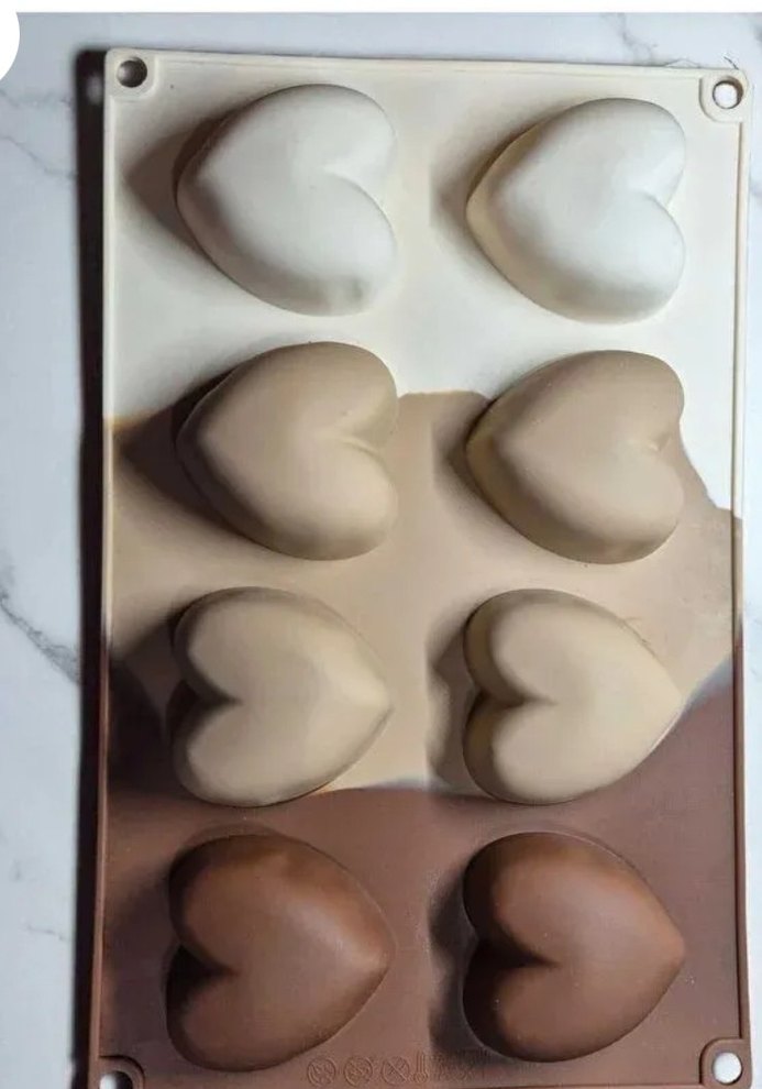 Bej renkte, kalp şeklinde sekiz gözlü kek kalıbı. Hafif silikon malzemesi sayesinde kolay çıkarma ve temizlik sağlar. ❤️