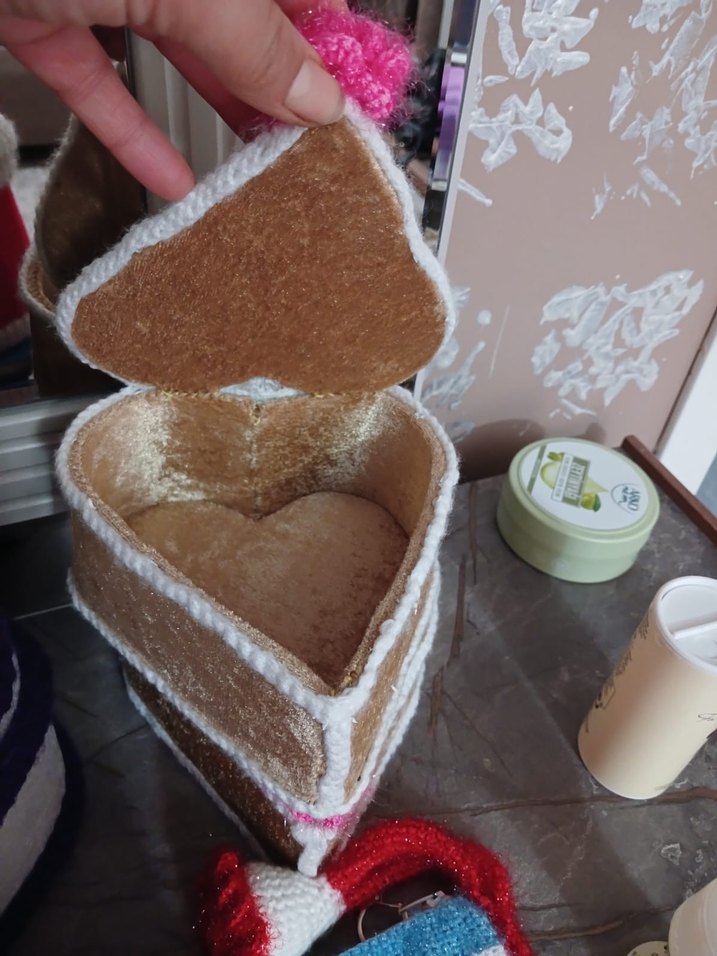 Yumuşak, sıcak kumaştan yapılmış, beyaz kenarlıklı bej kalp şeklinde kumaş el yapımı.