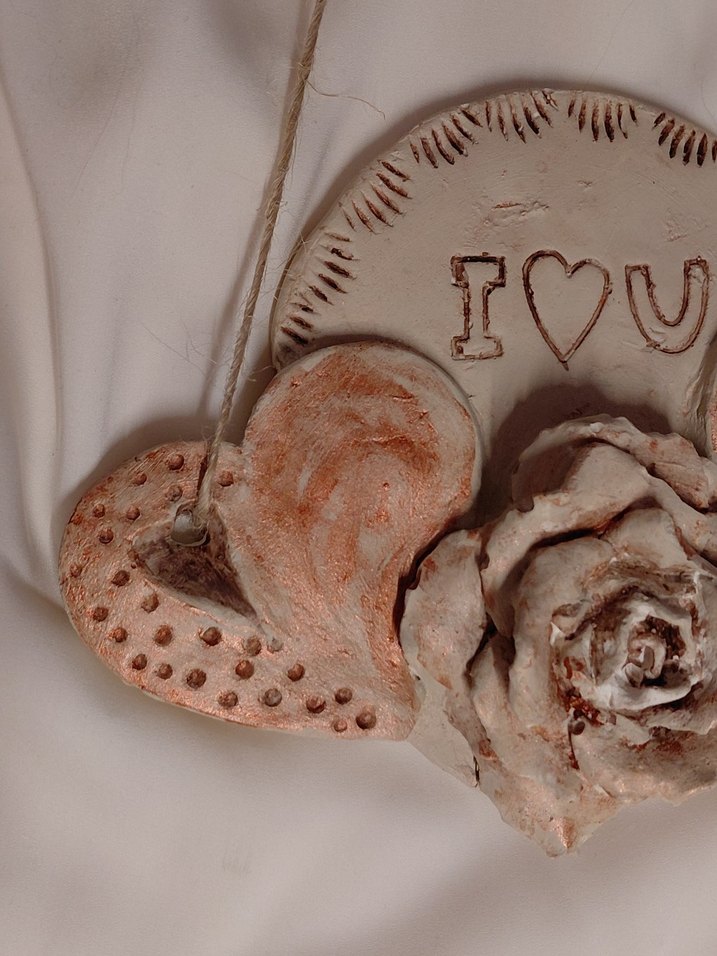 Bej renkli, kalp ve gül figürlü dekoratif süs. Asma ipiyle kolayca asılır, rustik dokunuş sağlar.