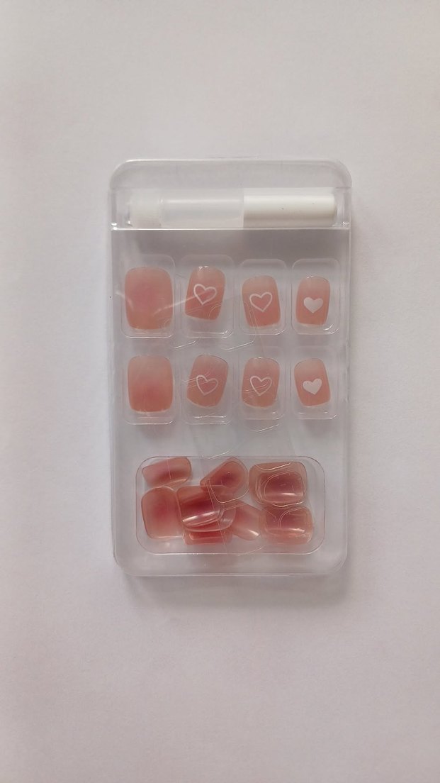 24'lü desenli bej yapay tırnaklar, kolay kullanım için yapıştırıcı ve aplikatör ile birlikte.