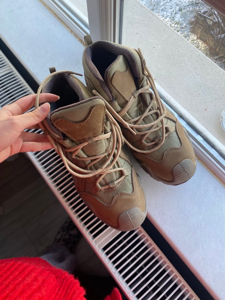 Bej ve gri kamuflaj desenli, bağcıklı ve kauçuk tabanlı erkek outdoor ayakkabısı, hic giyilmedi