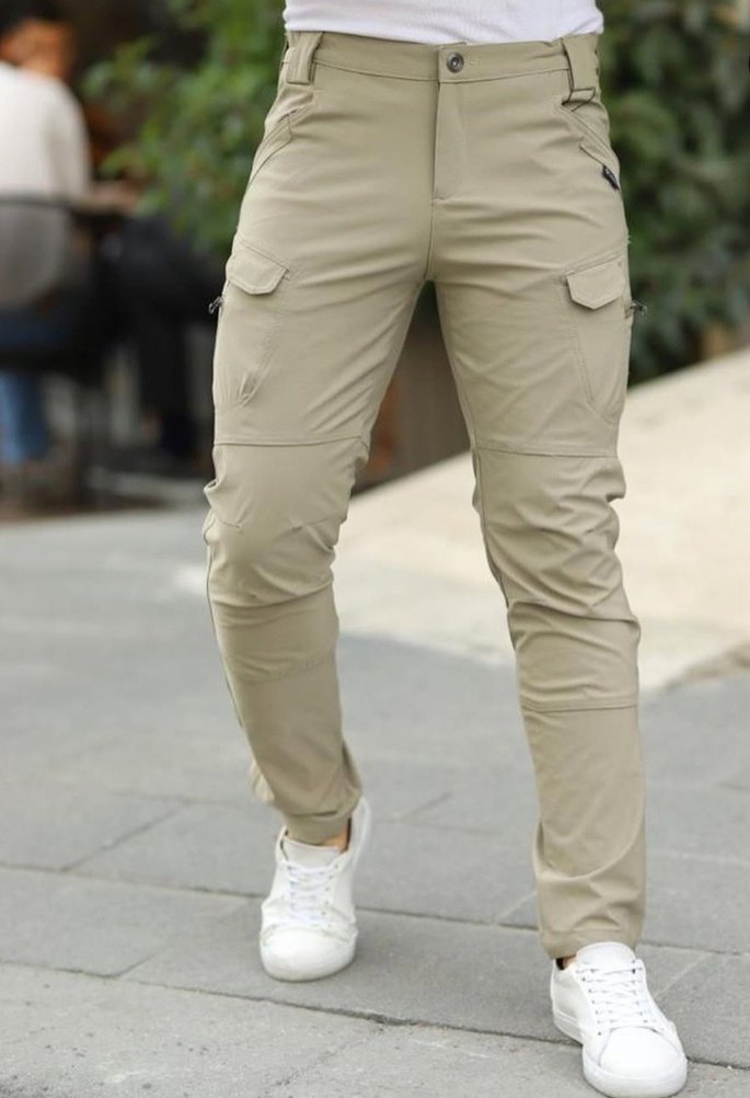 Bej renkli, açık kamuflaj desenli, kemerli erkek pantolon. Sentetik kumaştan, regular fit ve normal boyda, dış mekan kullanımı için uygun. ️