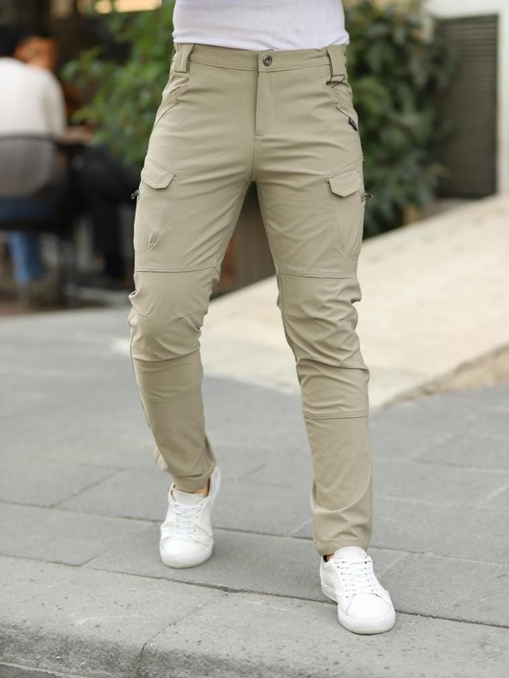 Hafif bej renkli, kamuflaj desenli erkek pantolon. Kemerli, normal boy ve regular fit, sentetik kumaştan, günlük dış mekan kullanıma uygun.