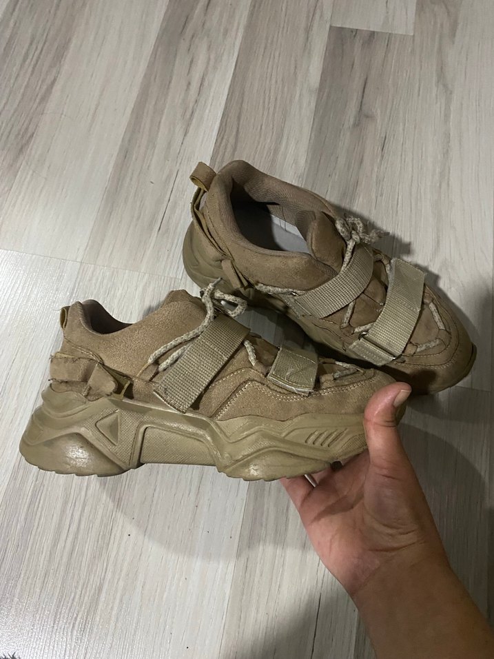 Bej renkli, kamuflaj desenli, platform topuklu ve kemerli kadın spor ayakkabısı. Kauçuk malzemeden, sokak tarzı için uygun.