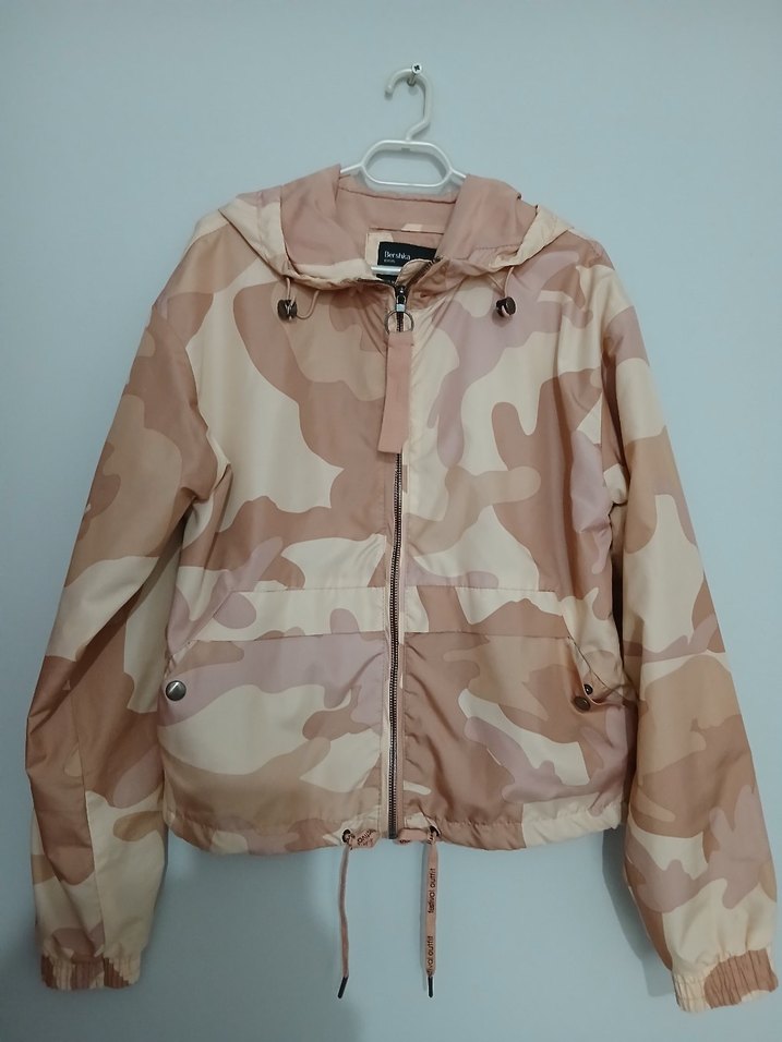 Sentetik kumaştan yapılmış, fermuarlı, uzun kollu, bej kamuflaj desenli, kapüşonlu ve normal boyda bol kesim kadın ceket.