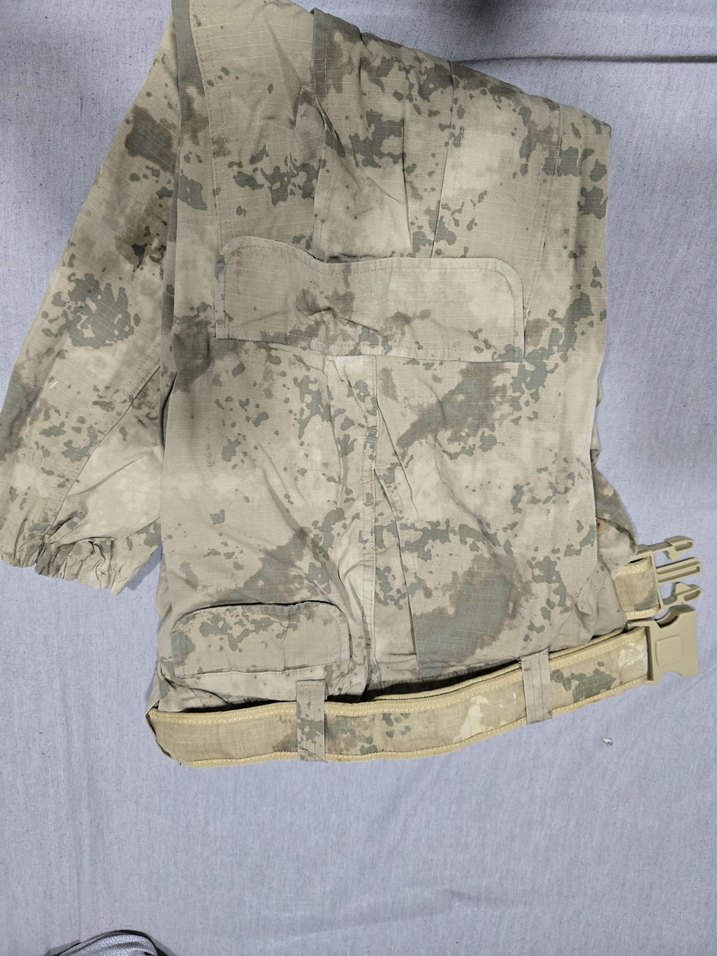 Bej kamuflaj desenli, kemerli ve bol kesim erkek pantolon. Sentetik kumaştan, normal midi boyunda, sokak stili için uygun.