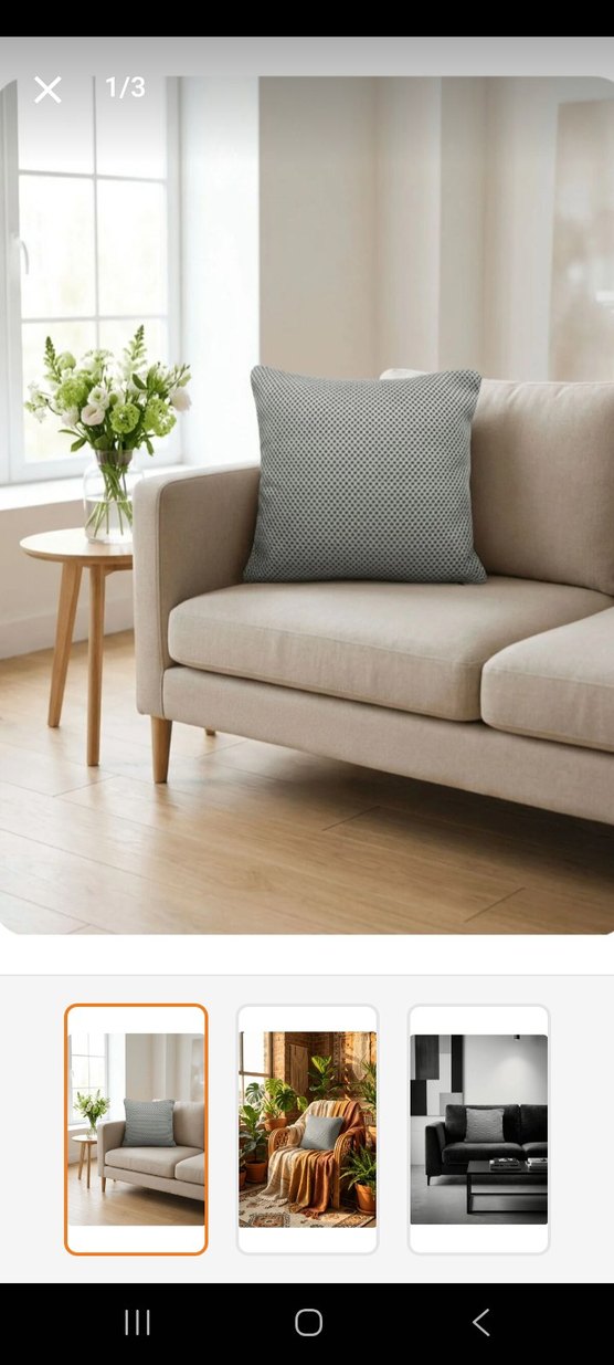 Bej kanepe üzerinde desen içermeyen modern gri yastık, oturma alanına sade bir dokunuş katıyor. ️