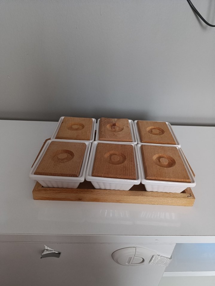 Bej kapaklı altı adet saklama kabı ve düzenli kullanım için ahşap tepsi içerir. tepside aşınma var ama kullanıma engel değil tabaklar porselen ağır
