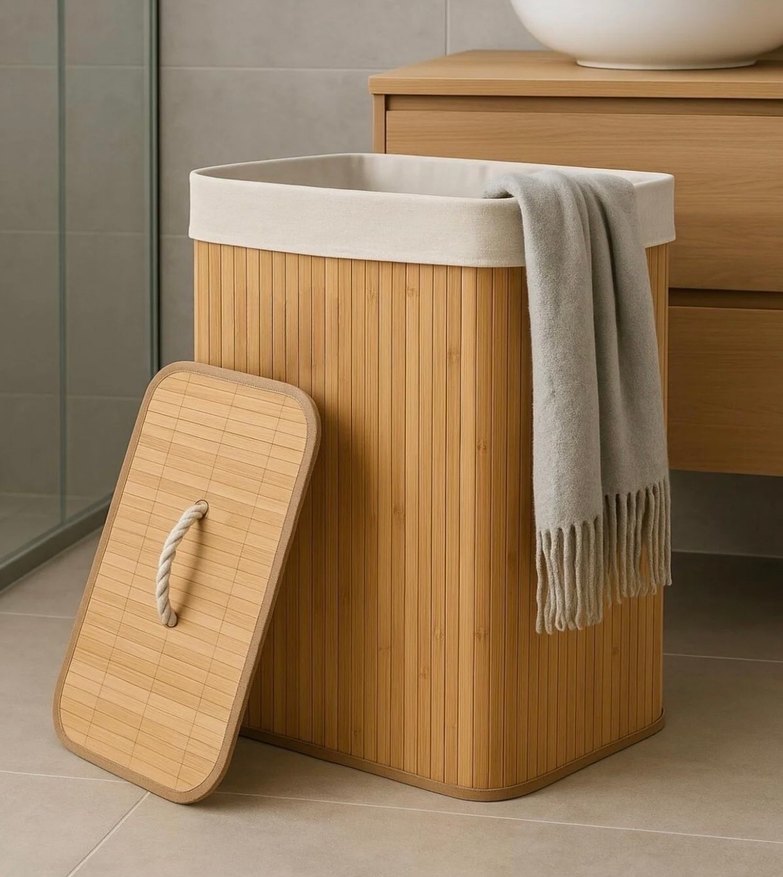 Kapağı çıkarılabilen ip tutma saplı bej kaplı dikdörtgen ahşap sepet, yumuşak kumaş astarlı, depolama için uygundur.