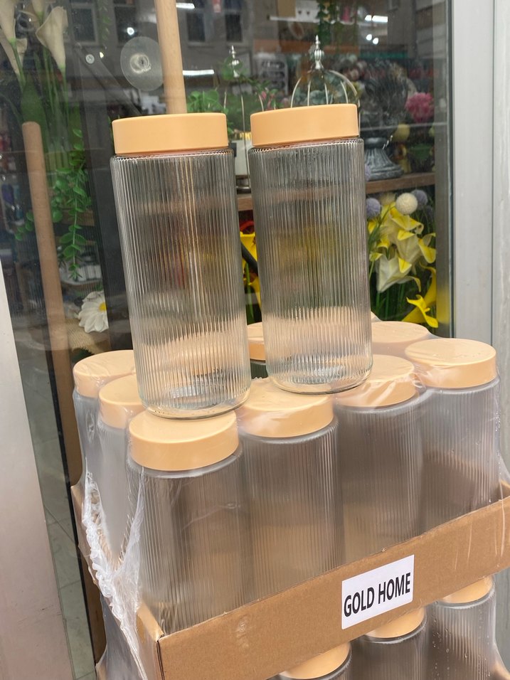 GOLDHOME saklama kabı, bej kapak ve şeffaf çizgili gövdeye sahip, çeşitli yiyecekleri saklamak için uygundur. Ürün camdır 1.5 lt