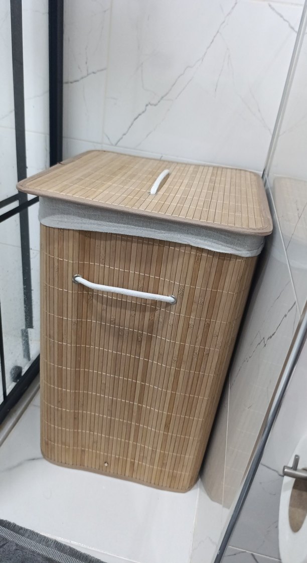 Kapaklı ve beyaz saplı bej hasır saklama sepeti, ev eşyalarını düzenlemek için kullanılır. kirli sepet