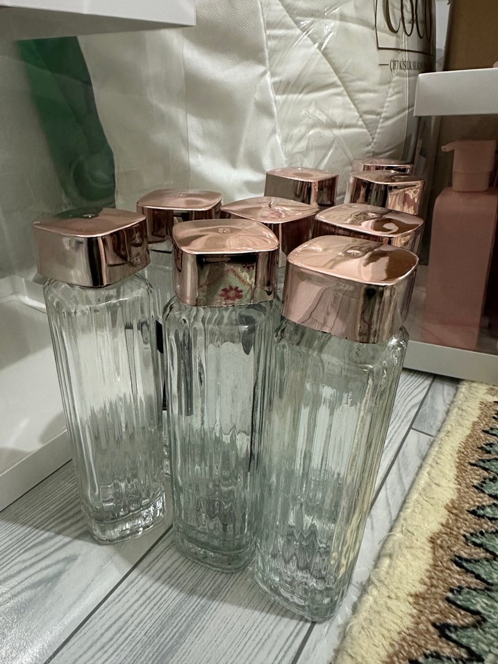 Bej kapaklı, şeffaf ve kabartmalı tasarıma sahip boş şişe 25 adet vardır