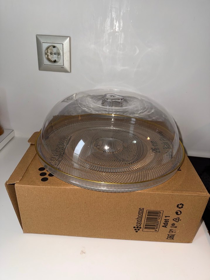 Bej renkte, şeffaf kapaklı servis tabağı. Üzerinde dokulu yüzey ve kapağında kolay tutma için kulp bulunur. ️
