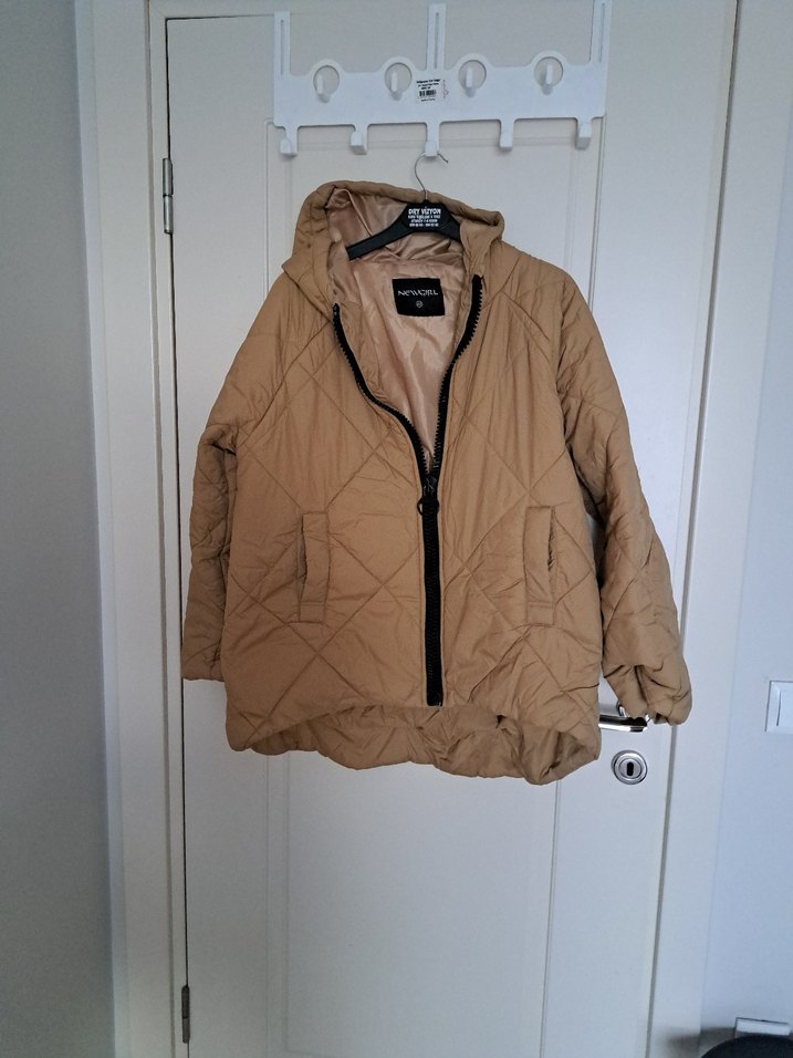 Uzun kollu, fermuarlı, kapitone bej kadın mont. Notlu yaka ve yumuşak, sıcak kumaş ile rahat kullanım sağlar.