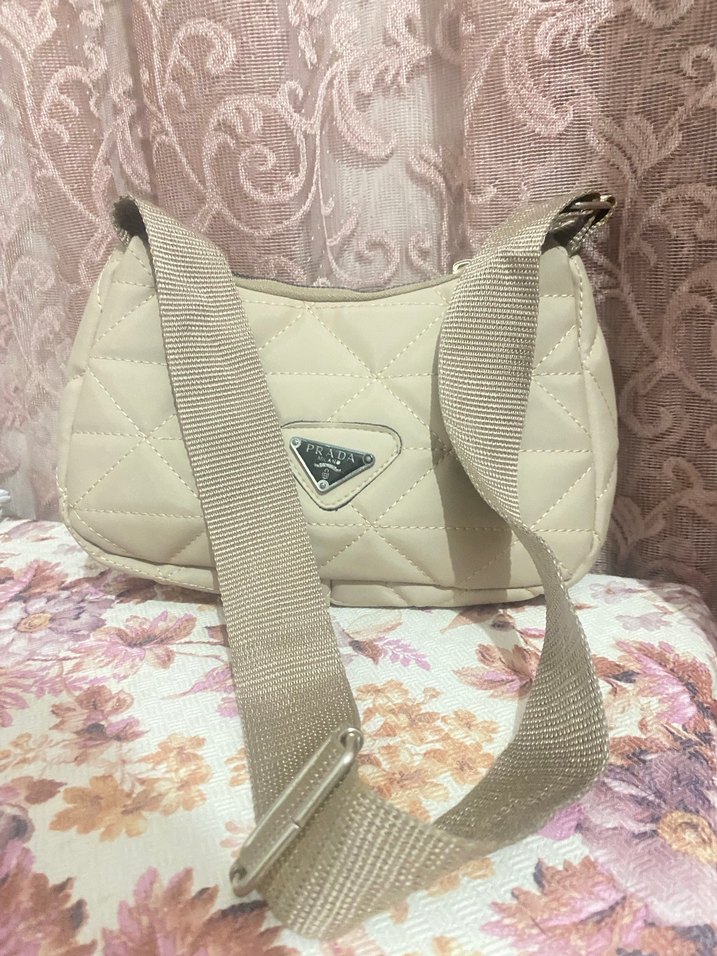 Bej kapitone sentetik kumaştan omuz çantası, tokalı askıya sahip, baskılı desende. Trendy günlük sokak stili için uygundur.