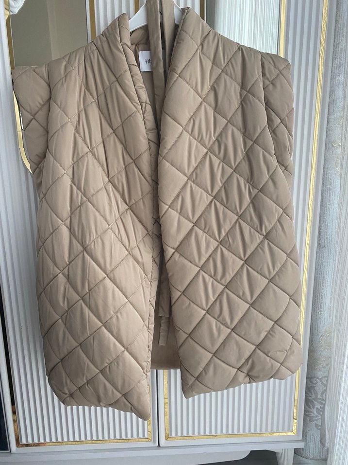 Bej renkte, kolsuz ve kapitone desenli kadın ceket. Kemerli ve askısız yakalı, midi boyda, rahat kesim ve yumuşak sentetik kumaştan üretilmiştir.