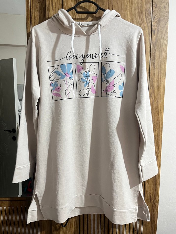 Bej renkte, uzun kollu, yuvarlak yaka ve bol kesim kısa uzunlukta kadın sweatshirt. Pamuk kumaştan üretilmiş, önünde baskılı desen bulunur. Rahat ve sokak stiline uygun.