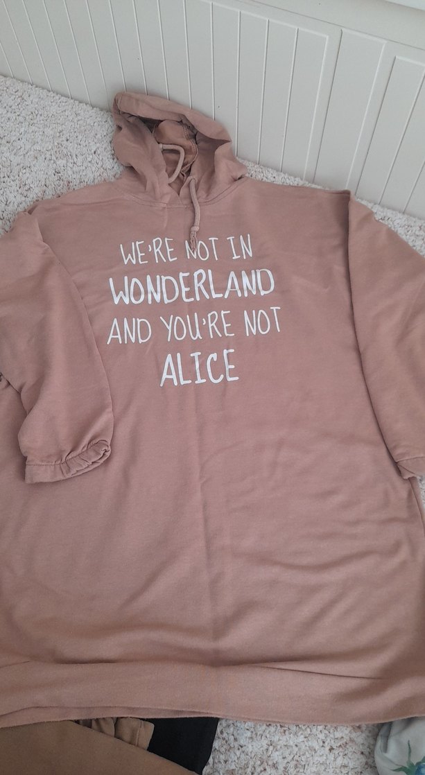 Bej renkte, kapüşonlu, uzun kollu ve bol kesim kadın sweatshirt. Önünde 'We're not in Wonderland and you're not Alice' yazılı baskı bulunur. tunik şeklinde fulladan alındı.
