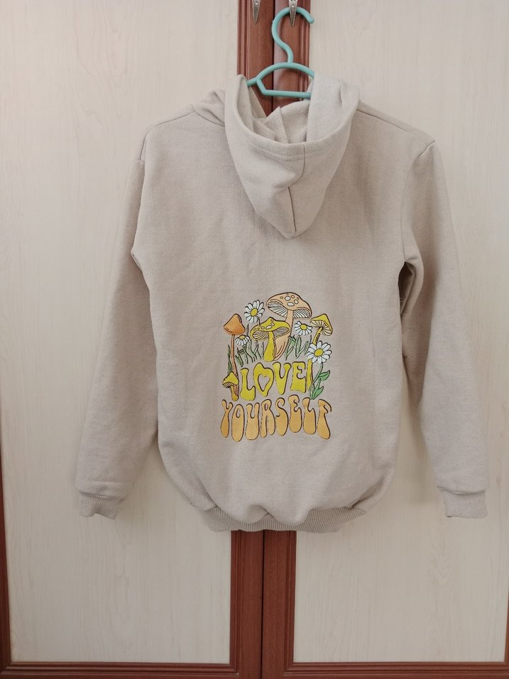 Bej kapüşonlu, uzun kollu, fermuarlı ve sırtında baskılı mantar desenli sweatshirt. Rahat kesim, yuvarlak yaka, yumuşak ve sıcak kumaştan üretilmiştir. bedeni küçük etiketi 12 yaş 9 yaş kızıma büyük aldım ama kalıbı çok darmış.cok giyemedi bu yüzden