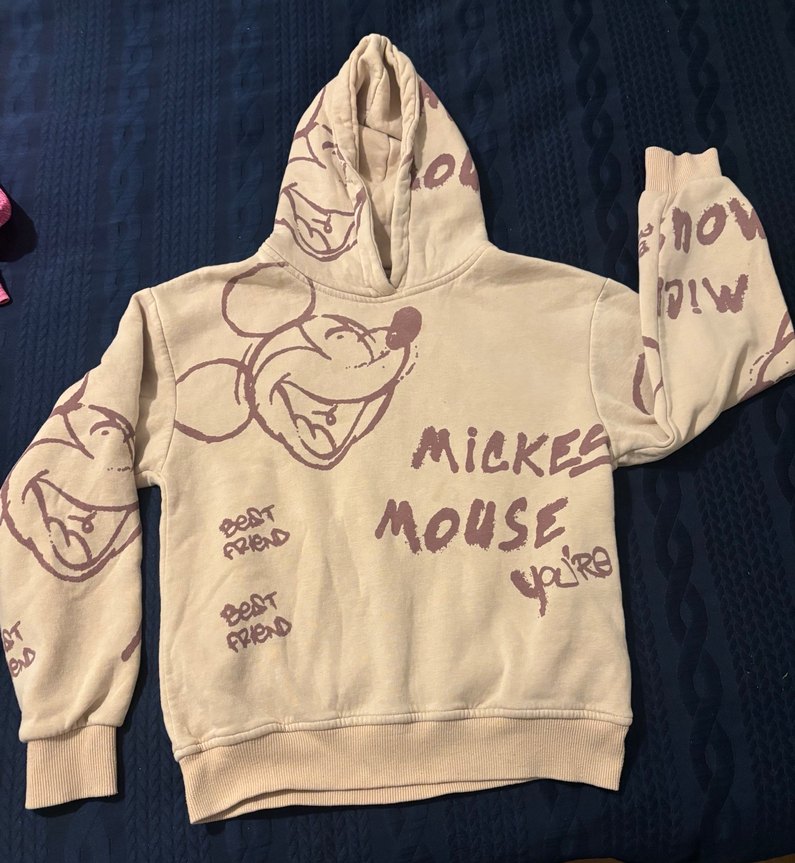 Yumuşak polar kumaş, kapüşonlu, uzun kollu ve bol kesim bej sweatshirt, baskılı Mickey Mouse desenleriyle.
