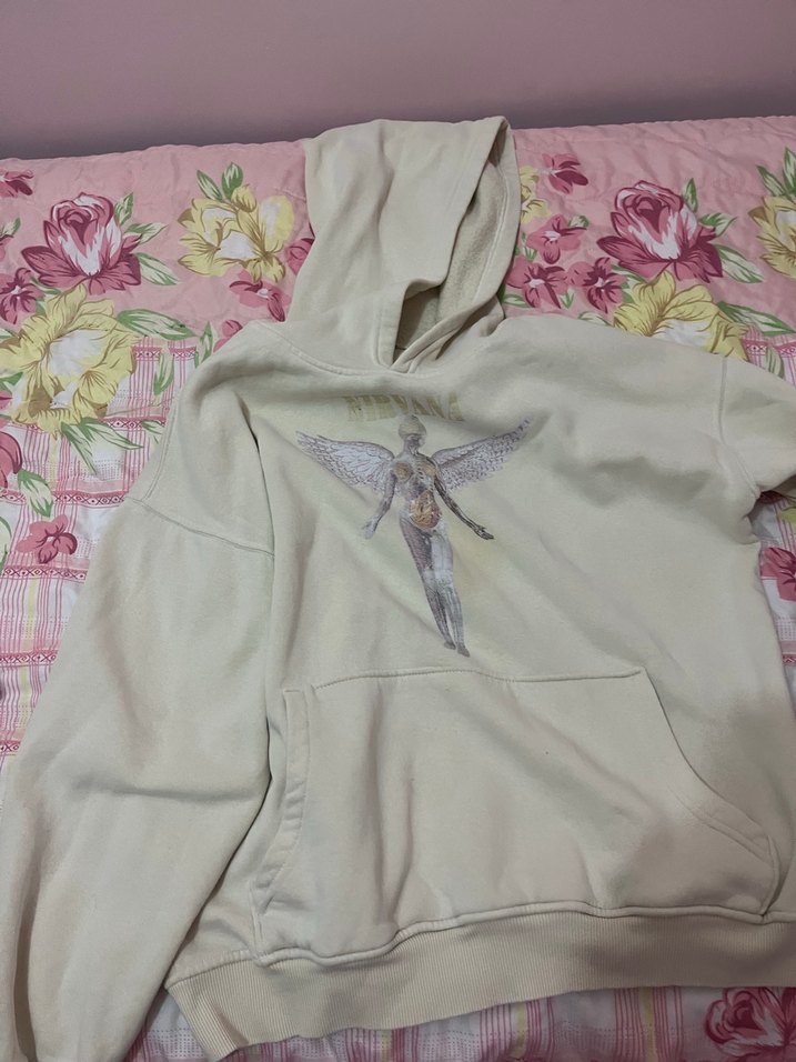 Yumuşak sentetik kumaştan, kapüşonlu ve baskılı, bol kesim bej sweatshirt. Uzun kollu ve fermuarlı, günlük kullanım için uygundur. Lekesi var o yüzden satıyorum ve artık 3 yıl oldu alalı carpeden aldım