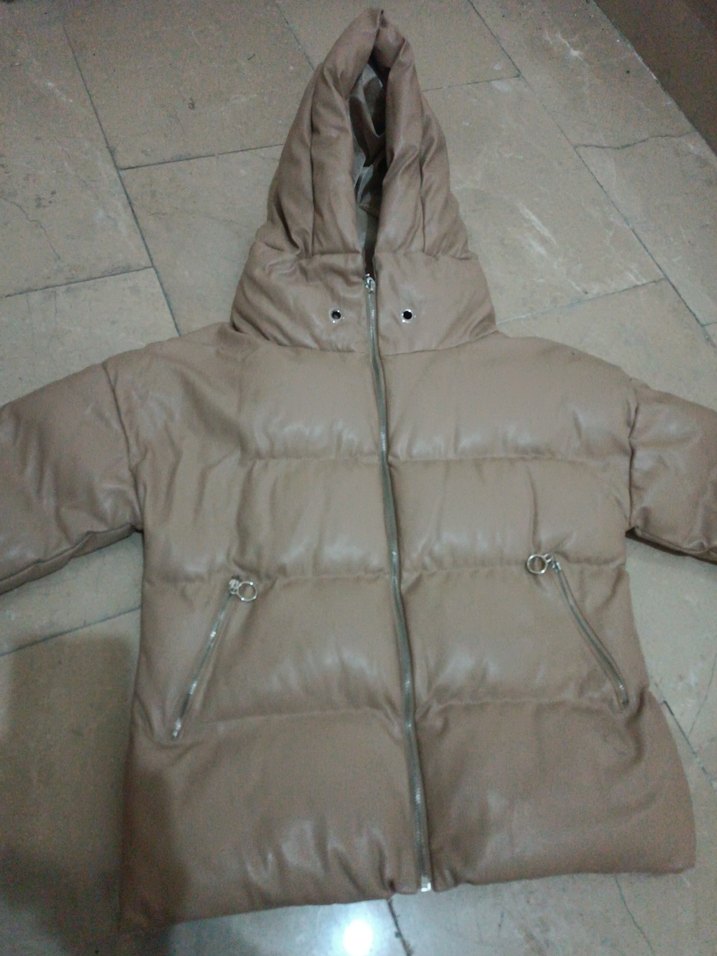 Bej renkte, kapüşonlu ve fermuarlı cepleri olan deri kadın kışlık ceket. Rahat ve günlük sokak stili için uygun, vücuda oturan kesimle tasarlanmıştır.